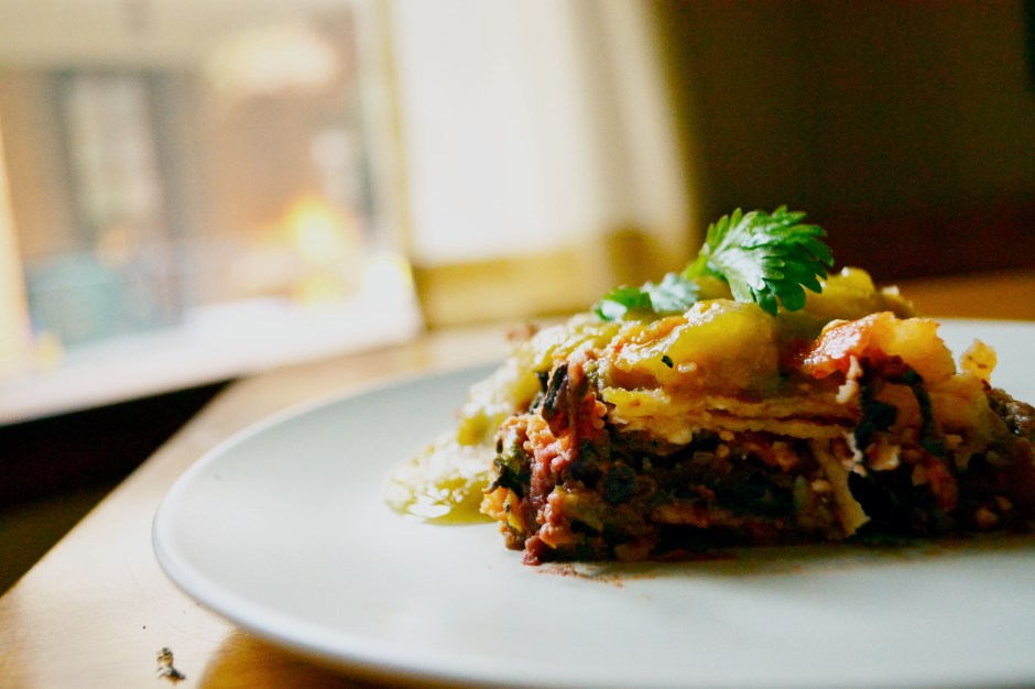 Black Bean, Sweet Corn, and Swiss Chard Enchilada Casserole