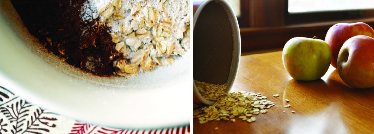 - Prepare topping by placing all of the topping ingredients (flour, spices, butter, oats) in a bowl or food processor. Mix until the mixture is crumbly (looks like coarse meal) and there are no large pieces of butter visible. If you are not using a food processor, you can use two knives or your fingertips. Set aside until you finish making the filling.