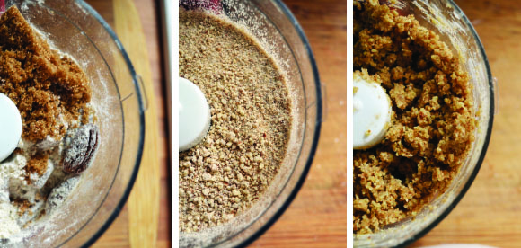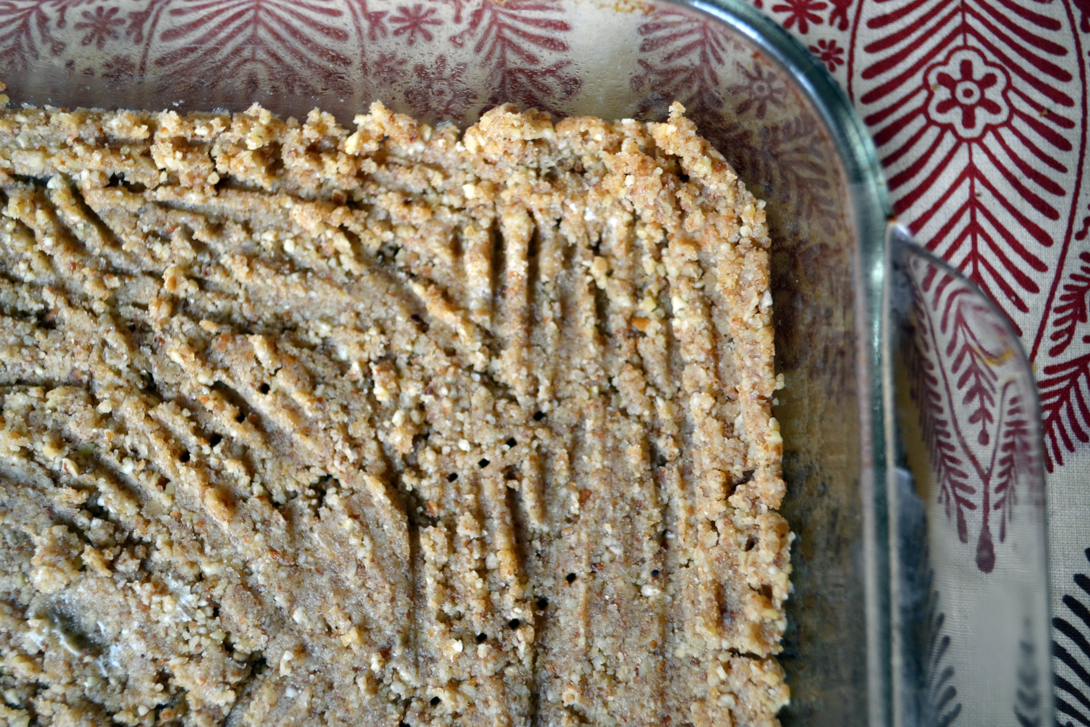- For crust, place all ingredients except butter in food processor. Process until a fine meal. Add melted butter and pulse until the ingredients come together to resemble a dough.