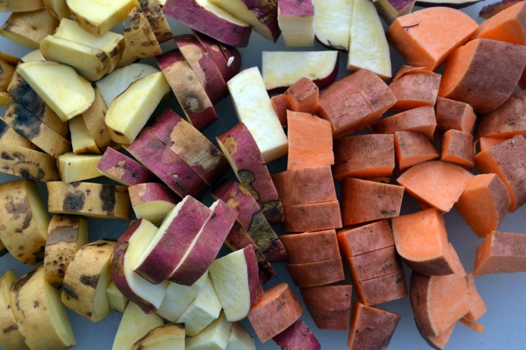 Sweet potato time! I love sweet potatoes any way you prepare them…except from a can. Bleck! There is a local urban farm that specializes in unique and heirloom varieties of vegetables. The typical sweet potato that is sold in the grocery store, pales in comparison to the varieties that you can find at your local farmers market which can vary with different skin colors and different flesh. Recently, I bought three different varieties of sweet potatoes: a Japanese (red skin and white flesh…creamy, smooth, and sweet), an O’Henry (white fleshed and super sweet), and a Beauregard (orange flesh and creamy).