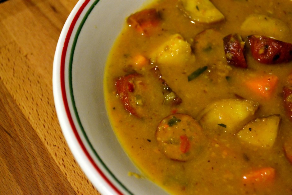 This soup is really easy. I found the original recipe in a vegan cookbook. I had a few chicken sausages left over that I threw in for added protein. For a vegetarian or even vegan version, leave out the sausage. It’s great both ways. You can easily use left over sweet potatoes in this soup.