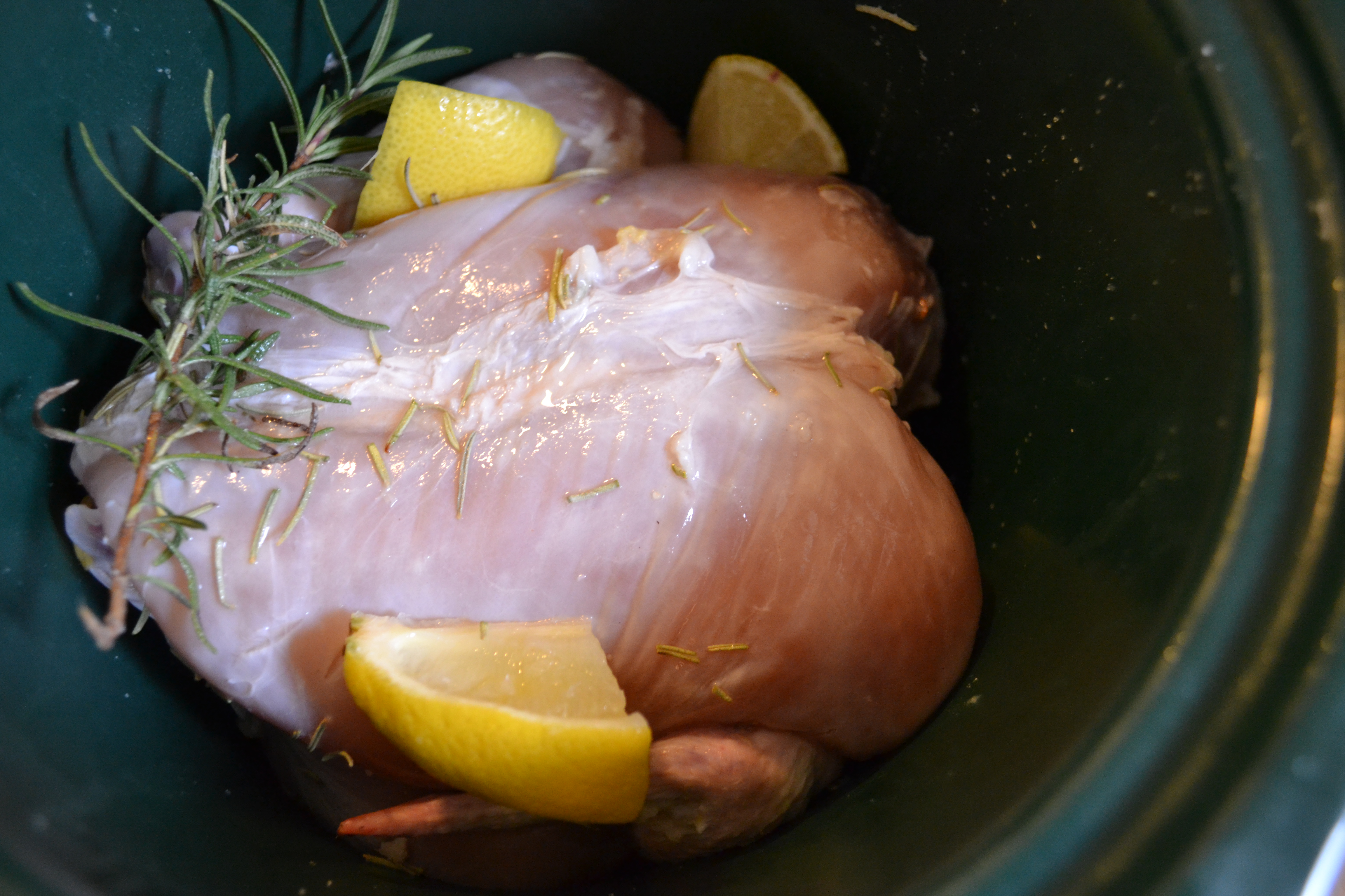 Once winter hits….my crockpot, madame crock of the pot, comes out. I don’t know why I don’t use her more often in the summer, but DANG she is handy. She is the queen of easy meals, hence why I call her madame because she seriously deserves it. Every time I pull her out of my cabinet, I feel like an old friend has come back to visit. She makes me feel all warm inside, filling my house with awesome smelling goodness. I love coming home from work to an easy already prepared dinner. Thank you madame crock o’ the pot. I recently used it to easily cook a whole chicken. The spices can vary in this recipe. I prefer a flavor that isn’t too overpowering so that I can shred the chicken and use it in other dishes. For this recipe, I simply used a whole lemon with some fresh rosemary sprigs, but feel free to throw in whatever you fancy.