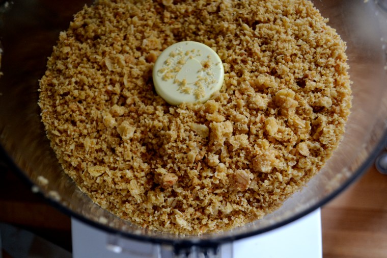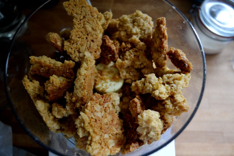 - Put the oat cookie from above in a food processor with the melted butter and salt. Pulse the food processor until the cookie is broken down into a wet sand. The ground cookie mixture should be moist enough to form into a ball. If it is not moist enough to do so, melt an additional 1-1 ½ tablespoons butter and knead it in.