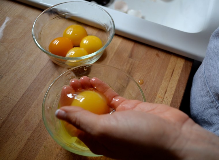 (Make sure that the egg whites are completely removed from the egg yolks. According to Christina Tosi, any amount of egg white in the mixture will ruin the consistency of the dense, custardy pie filling. The easiest, and best way to separate an egg is to use your hands, as shown in the picture below. Doing this by hand allows you to feel whether all of the egg white has been separated and removed from the yolk.)