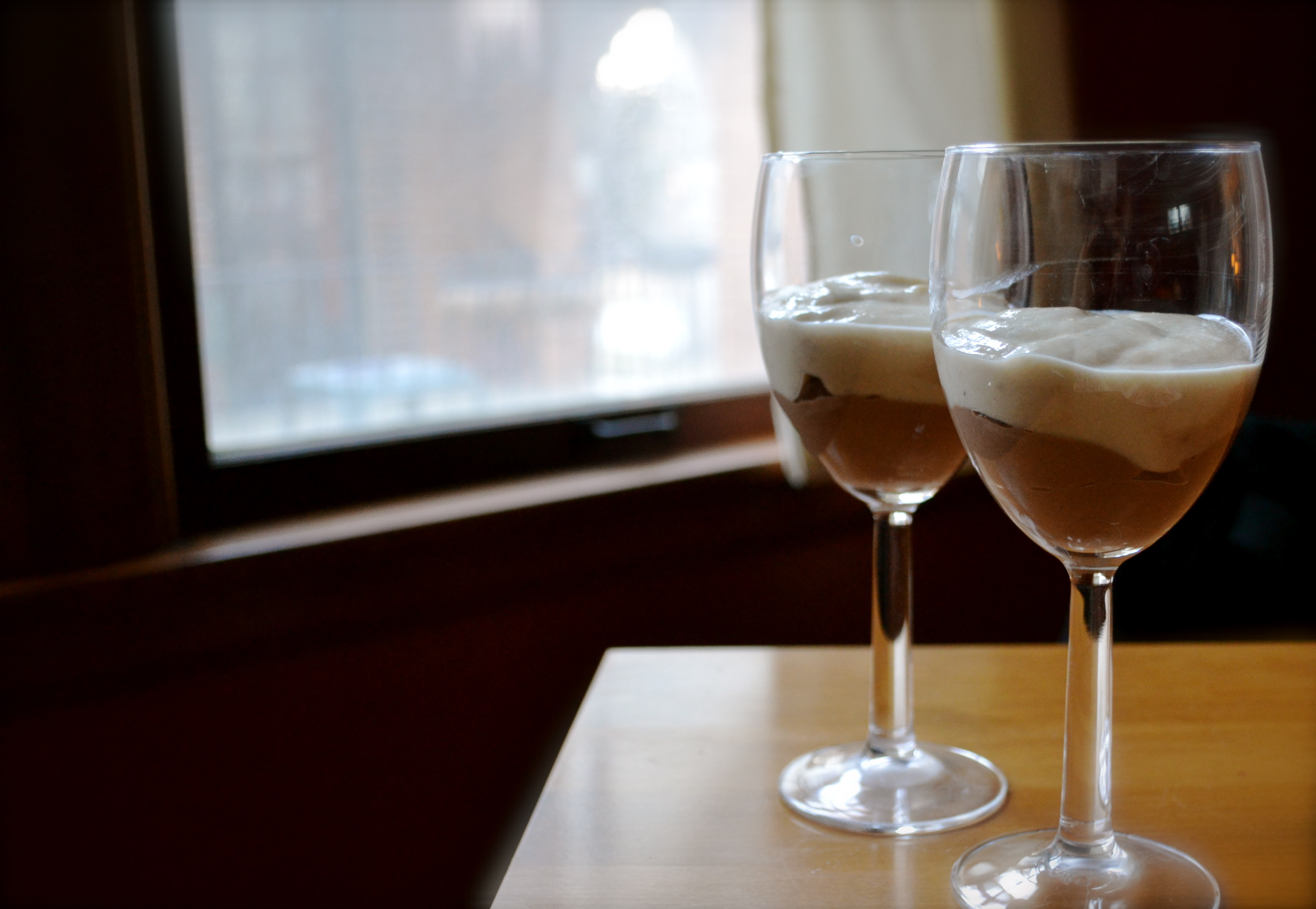 I found this interesting recipe for pudding in Mark Bittman’s Food Matters Cookbook. He uses tofu (stop rolling your eyes) instead of milk. The recipe basically takes a block of firm tofu and divides it in two portions. Half of the tofu is blended with melted chocolate, sugar syrup, and vanilla. The other portion of tofu is blended separately with bananas, sugar syrup, and vanilla. The food scientist in me was seriously curious. Would it be creamy? Would it be chocolaty? Would it be soy-y? The verdict…YES. YES. and not really.