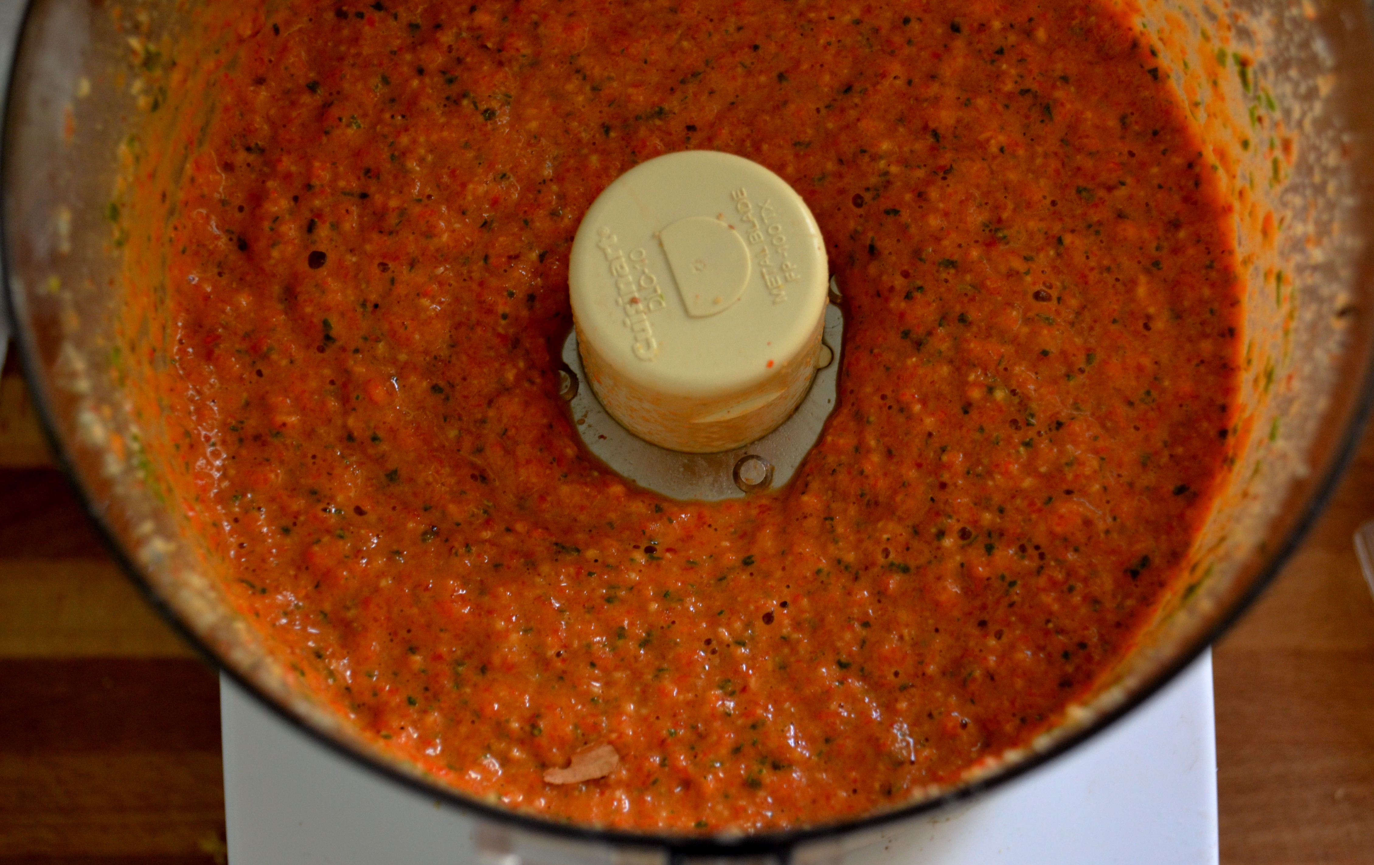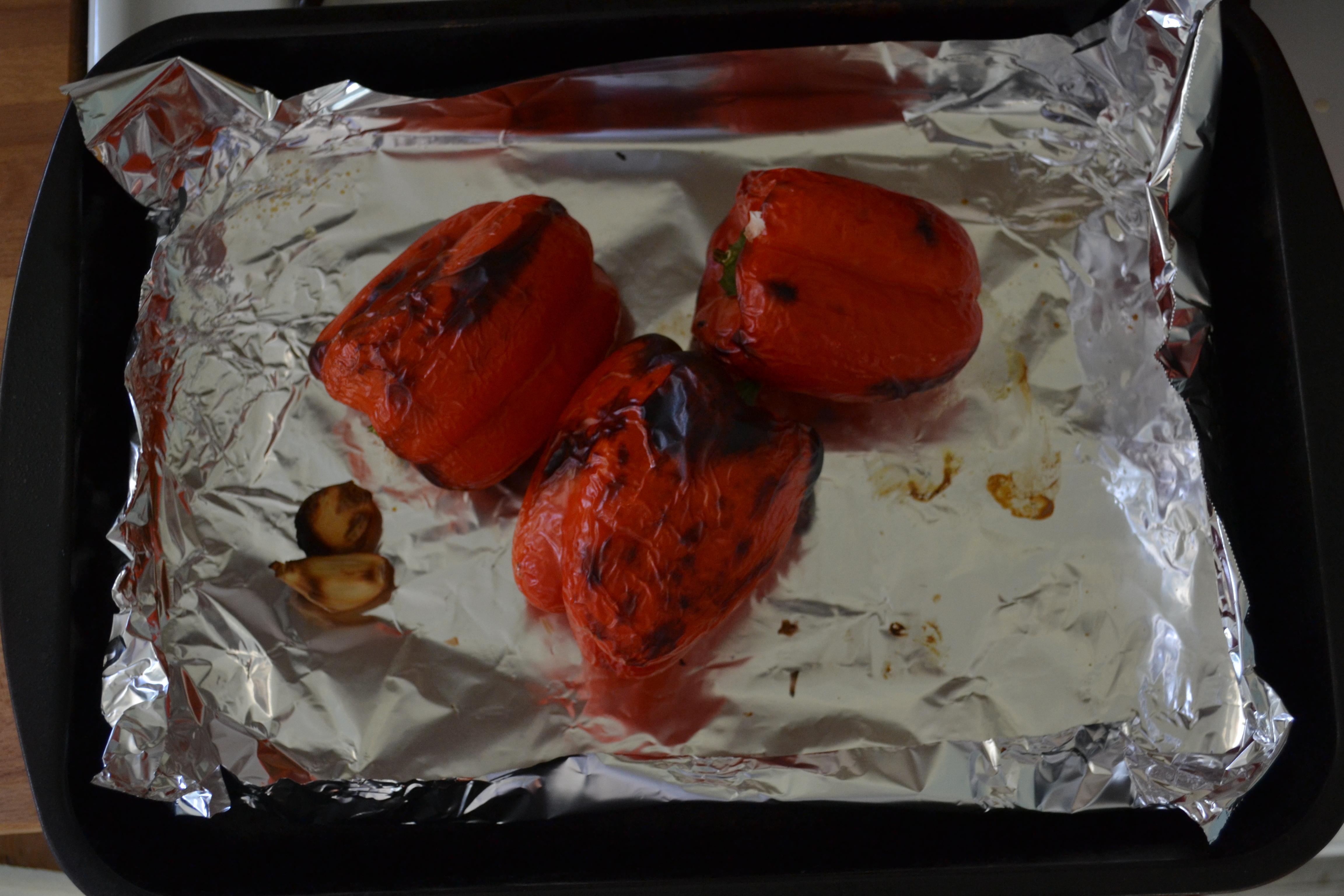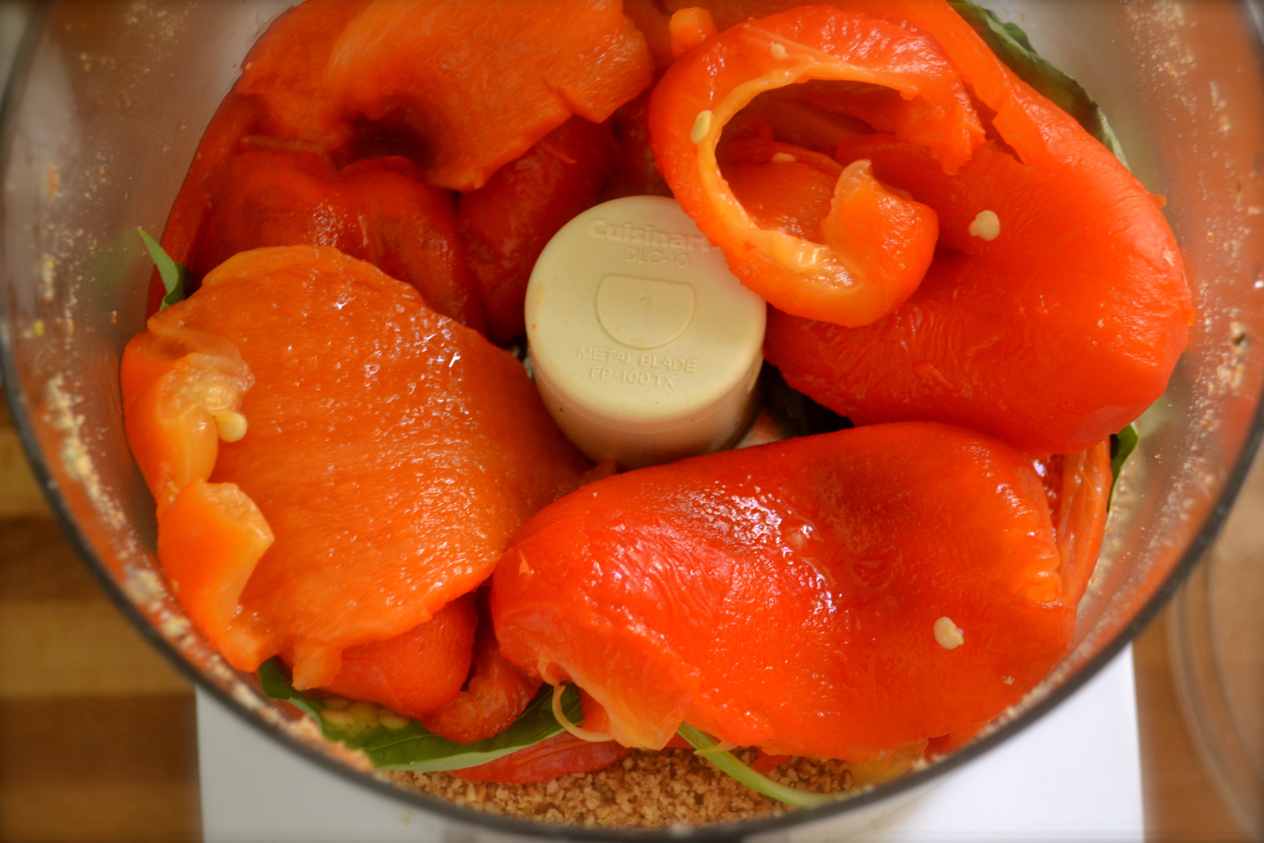 - Roast red peppers as described above or use jarred roasted red peppers.