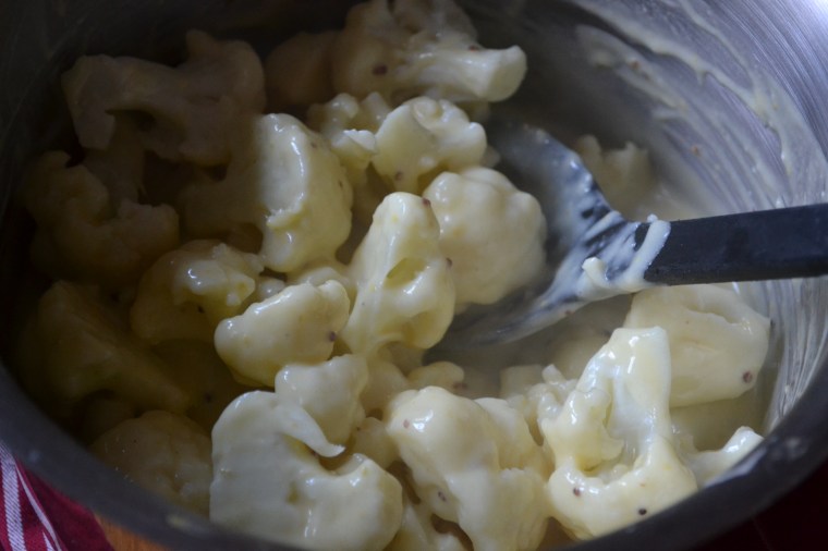 6. Toss steamed cauliflower and cooked pasta with cheese sauce.