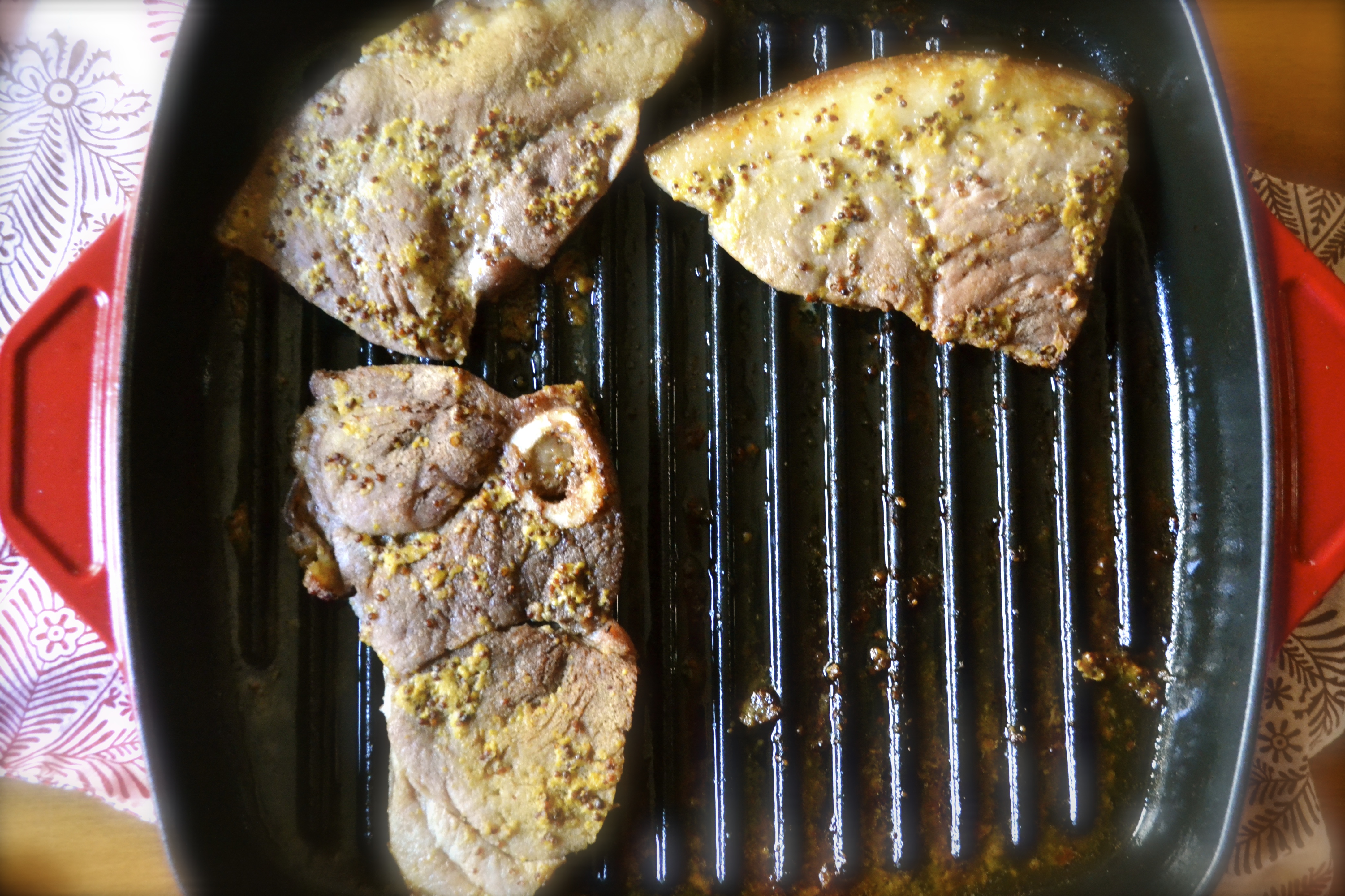 Even if you aren’t getting (booming voice) THUNDER SNOOOOOW…. you can still make a heart-warming breakfast that deserves being stranded in a snowy mountain cabin with a warm fire in the fireplace. My local Community Supported Agriculture (CSA) meat supplier provides us with 12 to 16 oz bone-in ham steaks. We like to brown these in a cast iron skillet for breakfast. In the summer, I like to cook these steaks on the grill. When cooking indoors in a skillet, I cut the ham steak into four equal portions to cook evenly and quicker. A simple Dijon sauce and butter-sauted apples pair well with the ham. This is even good as a quick dinner.