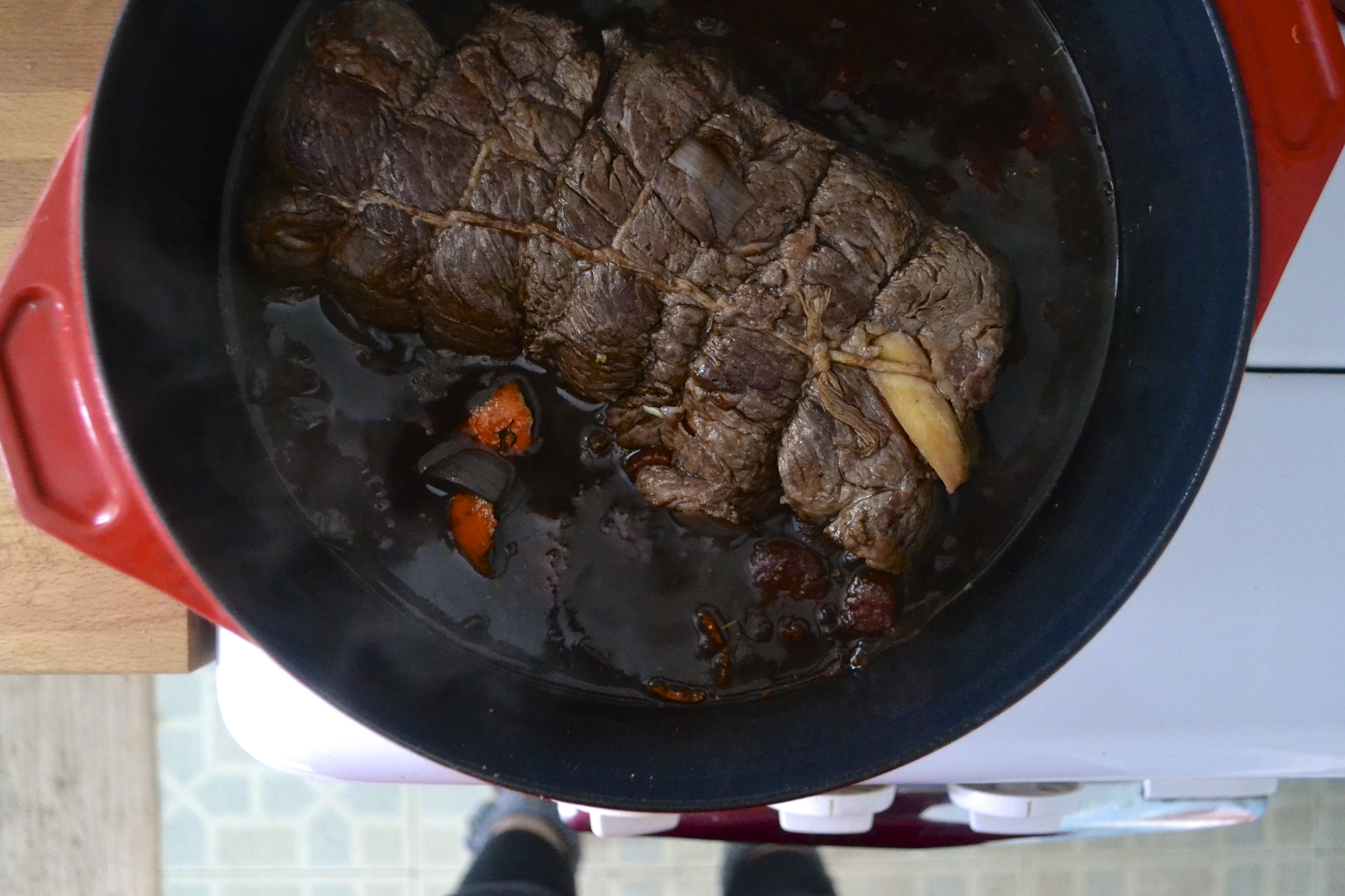 Make-Ahead Notes – This is a great dish to make for a crowd because the braised beef can be made ahead of time (up to a day or two in advance), with the flavors improving each day. To make ahead, prepare the dish through the oven-braising (Step 5). Allow the dish to cool to room temperature, then cover and refrigerate for up to three days. To serve, gently reheat the roast in the pot until the juices are once again liquified. Transfer the meat and vegetables to a baking dish, moisten with some of the juices, cover, and heat in a 325°F oven until warmed through. While the meat and vegetables are warming, proceed with Step 6 as directed below to make a sauce from the juices.