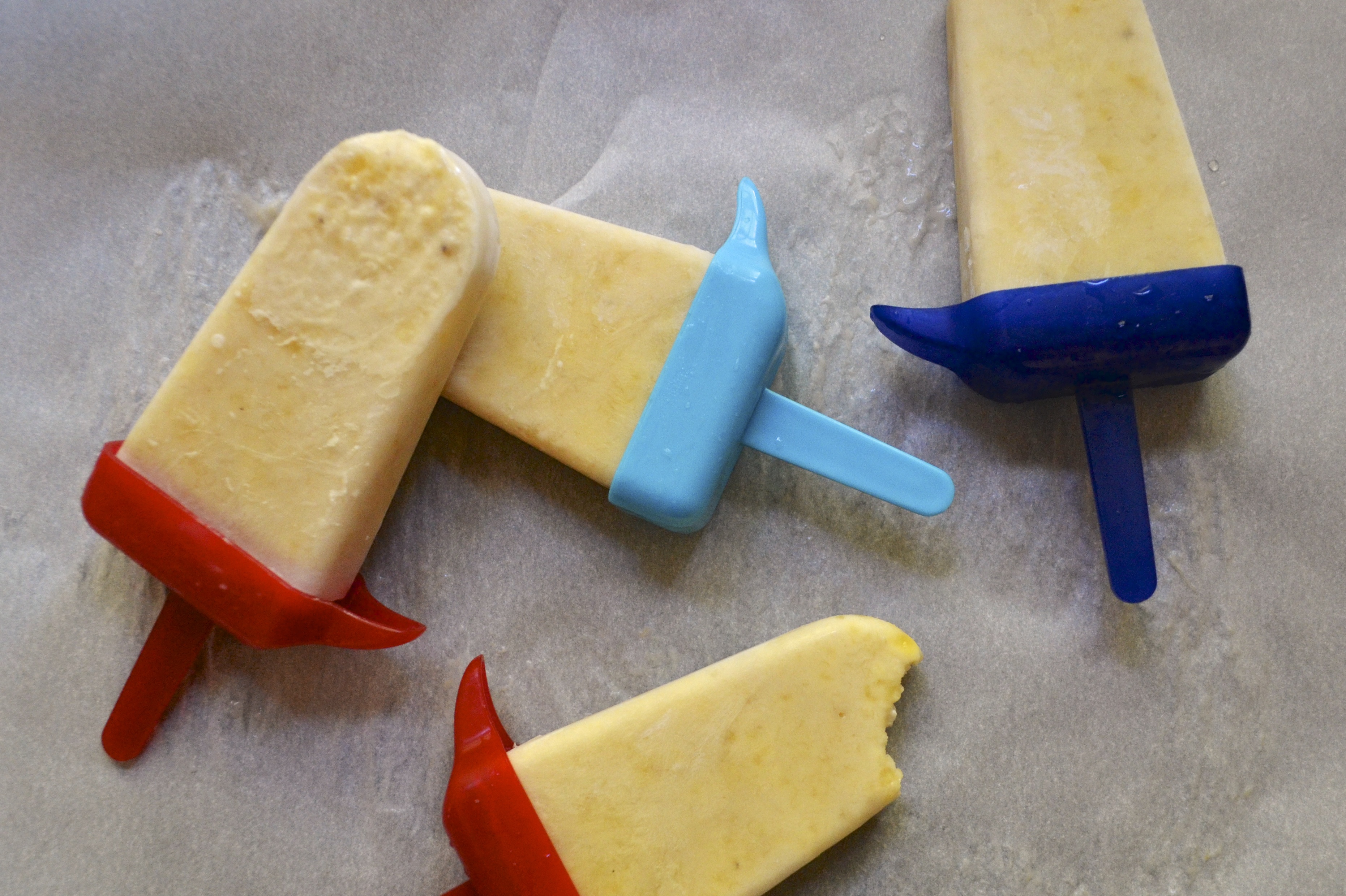 - Pour banana mixture into popsicle molds leaving 1/4-inch before the top to leave room for expansion. For popsicle molds that contain bases with sticks or hold wooden sticks in place, snap on popsicle base and freeze until solid, about 4 to 5 hours. If you do not have popsicle mods, glasses or open paper cups can be used. For these types, pour popsicle mixture into the glasses or open cups and freeze until the popsicle is beginning to set (about 1 1/2 to 2 hours). Then insert wooden sticks and freeze until fully solid (another 3 to 4 hours).