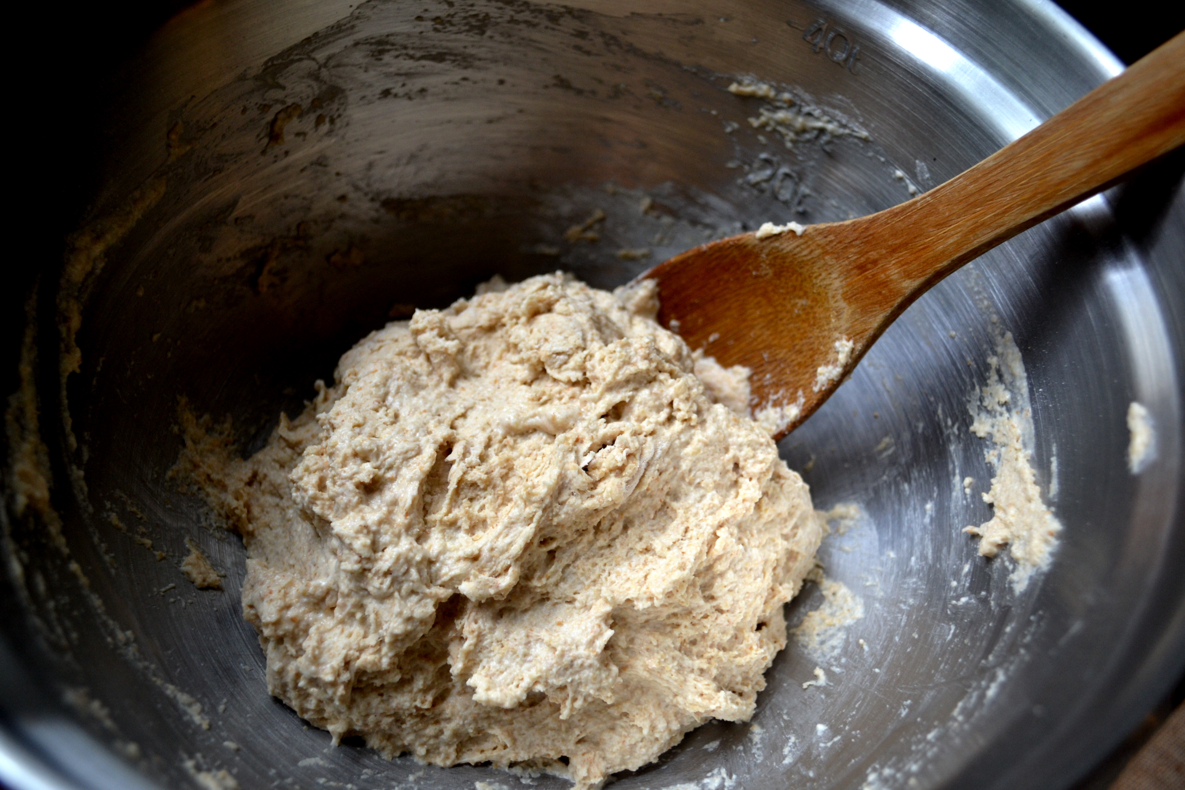 - Add water and stir with a wooden spoon till combined. The dough should be wet and shaggy and resemble biscuit dough or batter. Cover (not airtight) with plastic wrap or damp towel. Allow it to rest at room temperature until it rises and collapses (or flattens on top with bubbles) at least 2 hours, but it is best when left 12 to 24 hours. (If your house is cold, turn the oven on to 200 F then turn it off, placing the dough on the oven to rise).