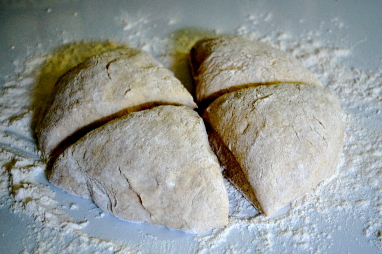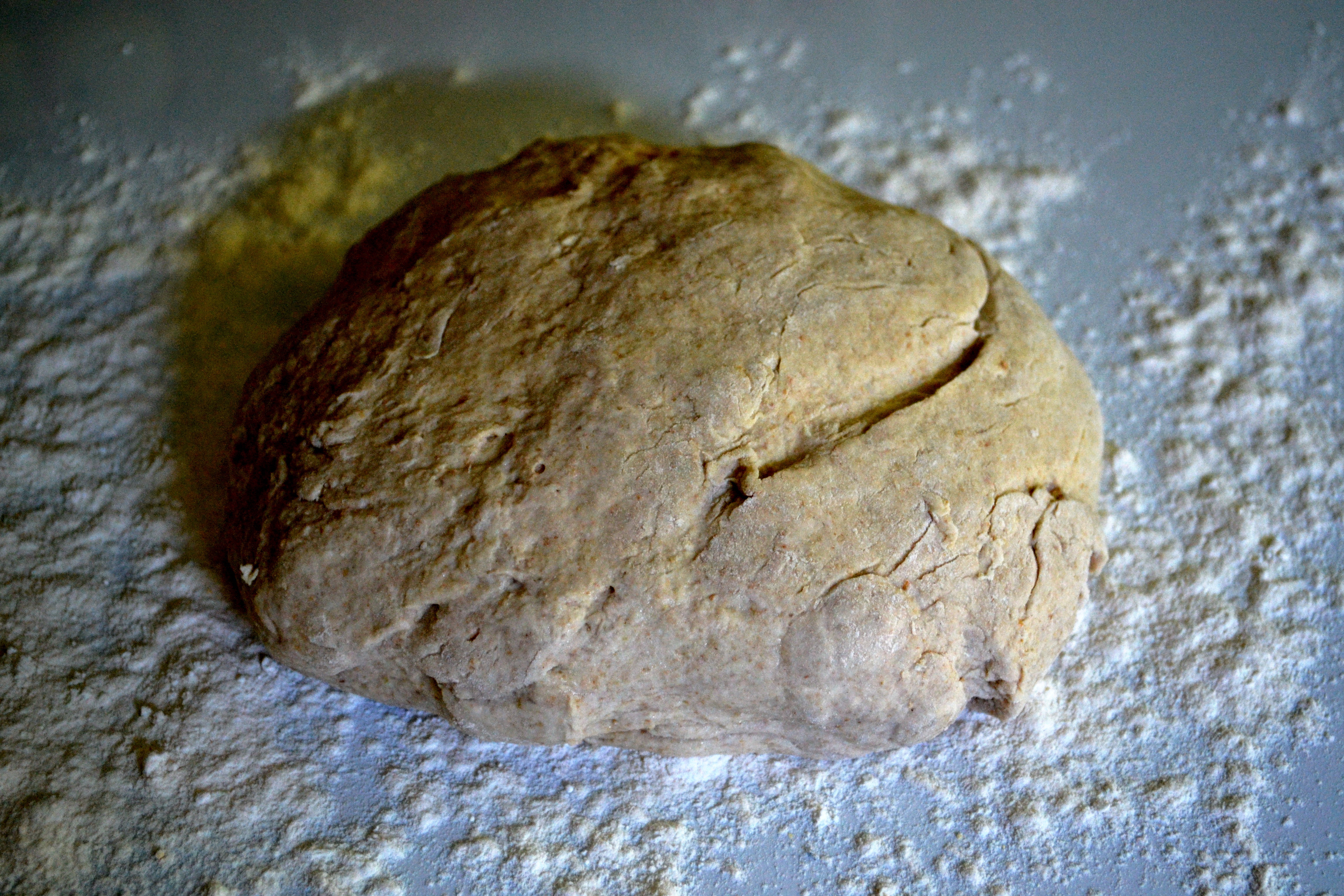 - When you are ready to bake the bread, dust the surface of the refrigerated dough with flour and shape into a ball by stretching the surface of the dough around to the bottom on all four sides, rotating the ball a quater-turn as you go. At this point you can either place in a loaf pan or bake on a pizza peel for an artisinal loaf. For the artisinal loaf, place the loaf to rest on a greased cookie sheet (can also dust the cookie sheet with cornmeal). Loosely cover the dough with plastic wrap and allow to rest for 1 1/2 hours.