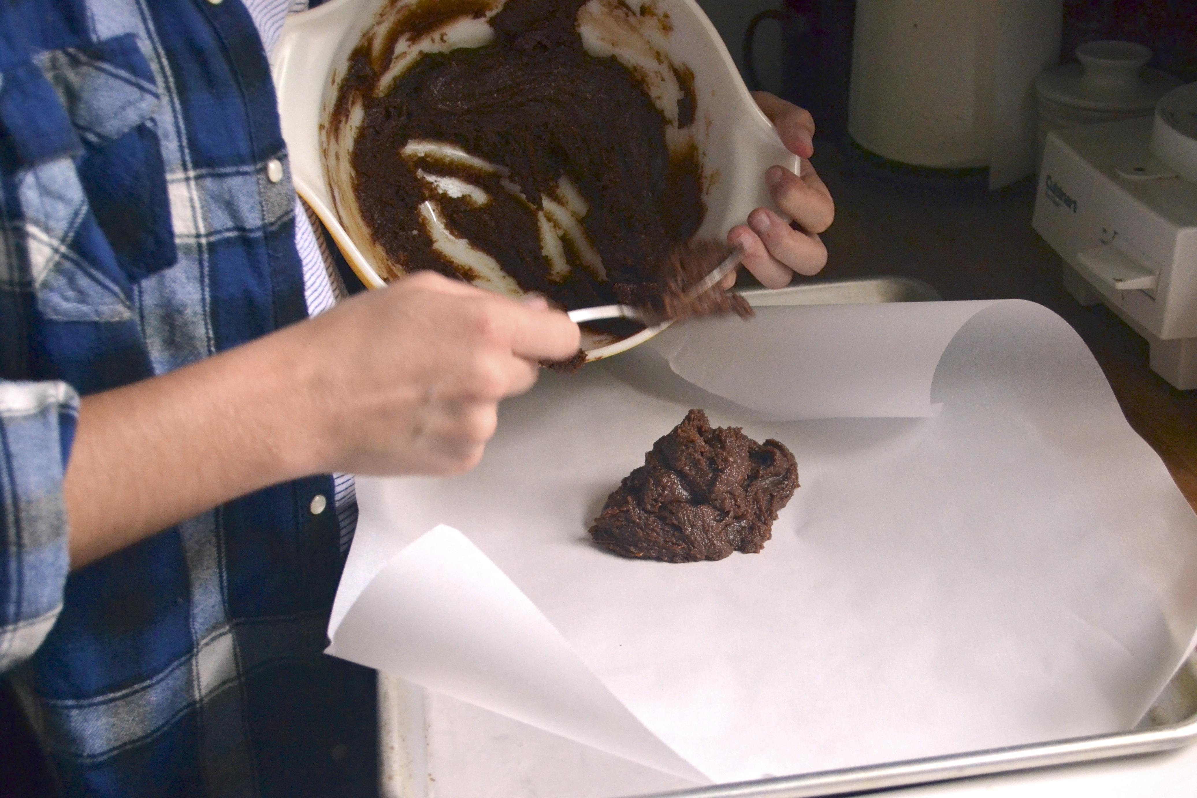 - Place parchment paper on a baking sheet or plate. Plop spoonfuls of the no-bake cookie mixture onto prepared pan/plate. If it is too warm in your kitchen, place the cookies in the fridge to set. Because there is coconut oil in this recipe, the oil will tend to melt a bit at room temperature. Keeping the cookies in the fridge will ensure that they are firmer.