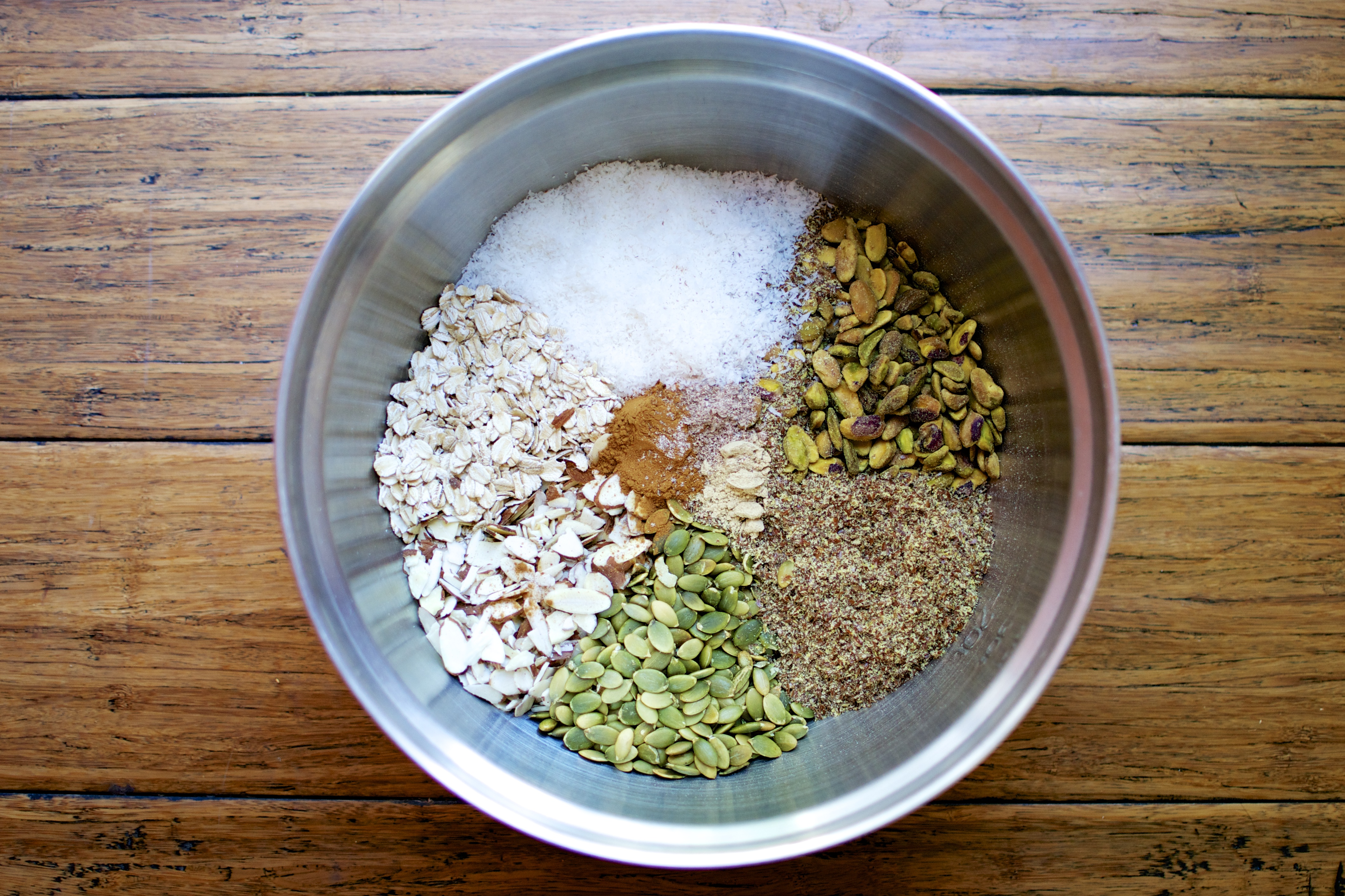 Also, I like to kick up the nuts and seeds ratio and lower the amount of sweetener. Nuts and seeds increase the protein content of the granola which helps keep you satiated and controls blood sugar spikes. This recipe also only has 1/2 cup of sweetener.  I prefer to use maple syrup as the sweetener because it adds a great warming aroma and flavor to the granola, while being a 100%-natural sweetener.  You could also use honey or coconut palm sugar.