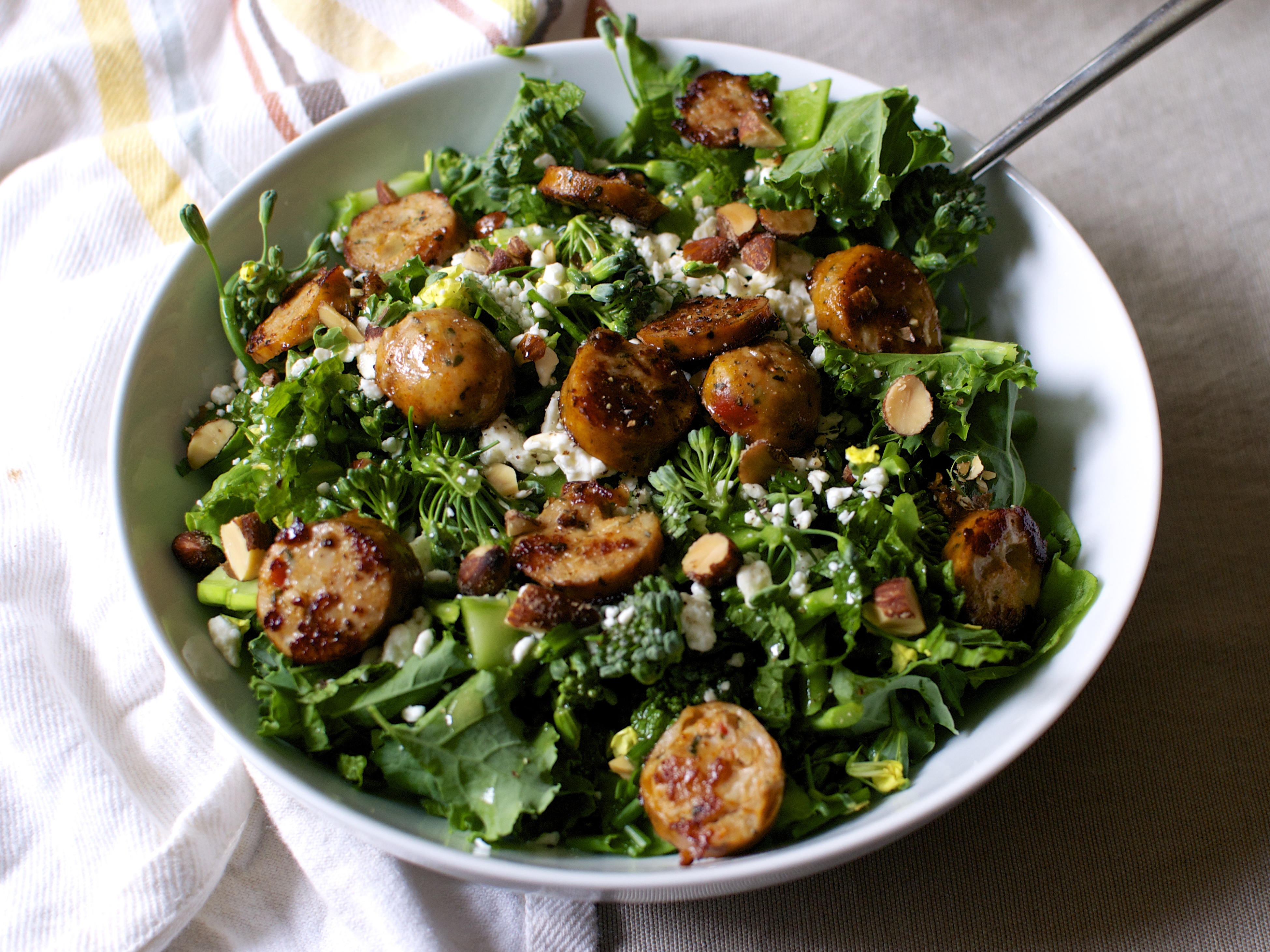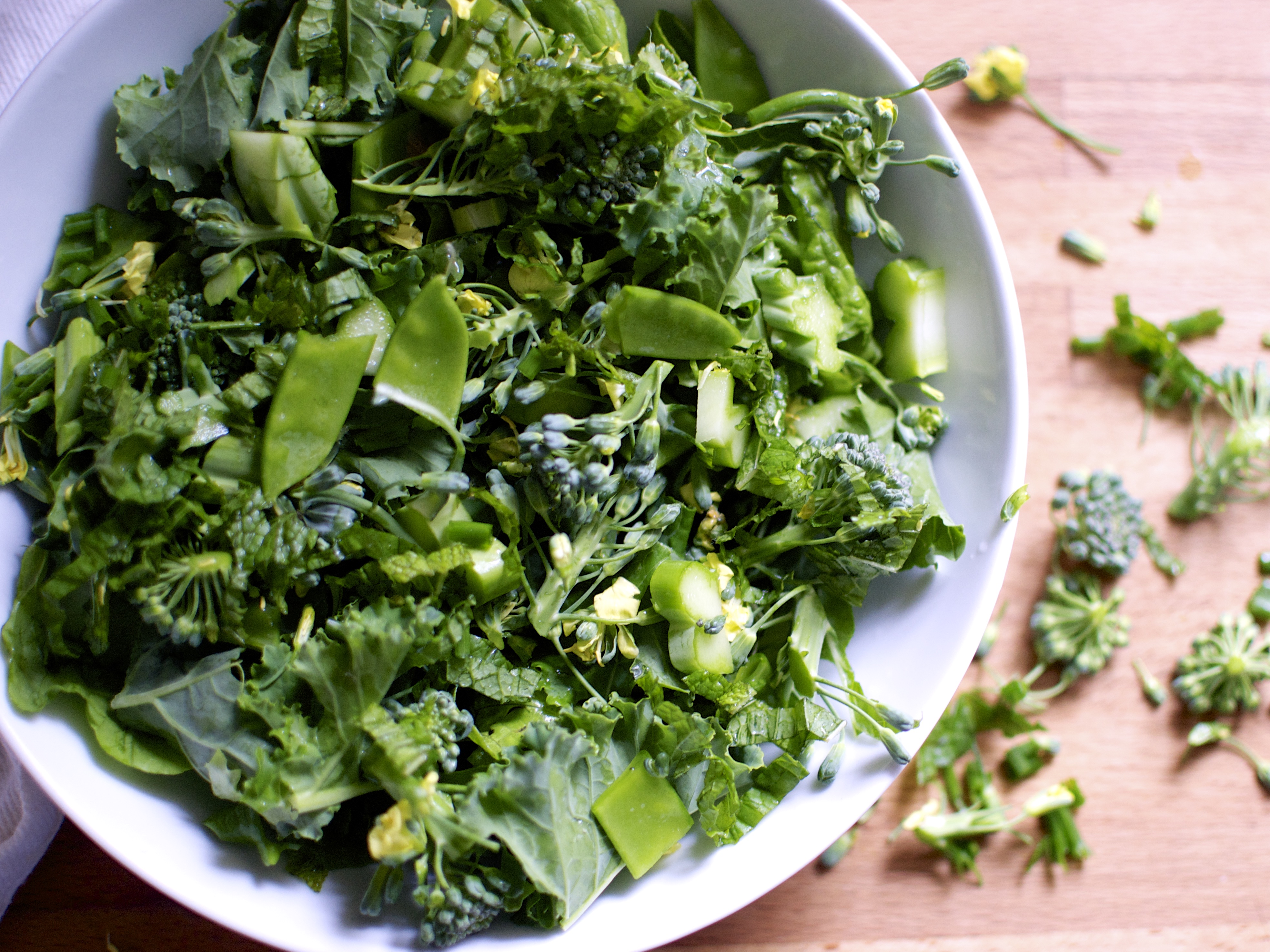 But this year, six years into BEING A GARDENER, my garden is growing like a REAL garden!  Thank you again, mother nature. I have one of the biggest lettuce crops (which love these cool temps and tons of rain that KC has gotten this spring). I also have gorgeous broccoli heads! Oh and peas! I have snow peas climbing a trellis (actually it’s a defunct hand rain I pulled off my outdoor stairs) and tiny pea pods dangling everywhere! Kale is coming up like a champ! Baby beets are gearing up and their greens are getting taller.  I’m even growing brussels sprouts and cauliflower for the first time. Way to go me! I hope my grandma would be proud. I think she’d also really love this Super Green Spring Salad that I’ve been making from all of my garden goodies!