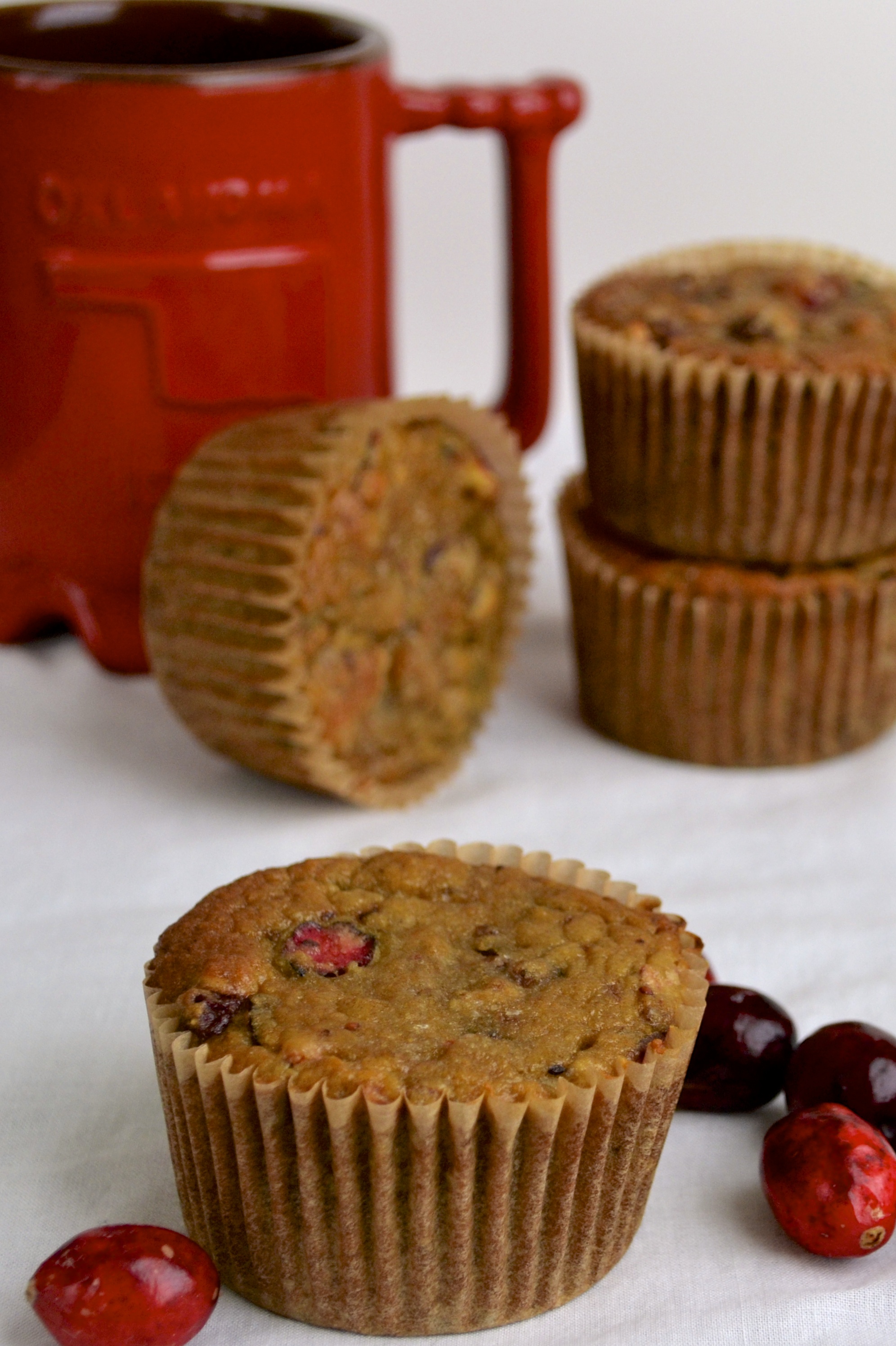 These muffins come together just using the food processor! It’s easy! No need to dirty multiple bowls. I adapted a recipe from Danielle Walker’s Against All Grains cookbook (best grain-free cookbook around, folks), swapping out the almond flour for tapioca flour for a nut free muffin version. I also added fresh cranberries for a fleck of holiday red and a punch of perfect tartness.