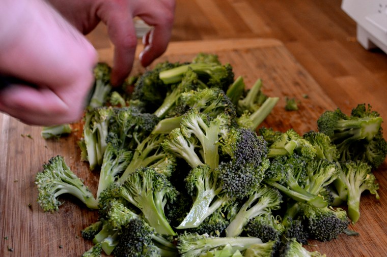 - Chop the broccoli florets from the stalk. Chop the florets into small portions. Cut off the bottom fibrous portion of the stalk and chop the tender portion into 1/4-inch bite-size pieces.